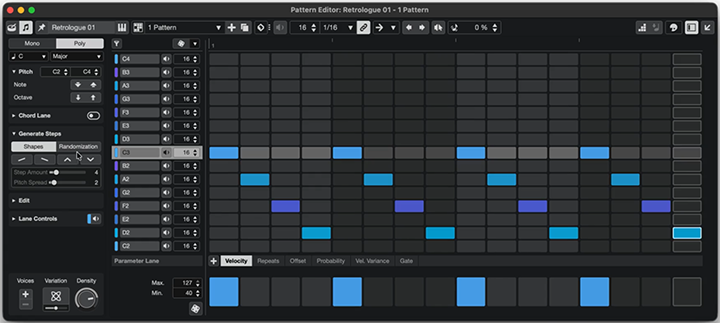 在模式编辑器中,使用单音和多音模式、步进输入、 自定义音阶、形状生成器和深度随机化器,创造富有 表现力的旋律模式。
